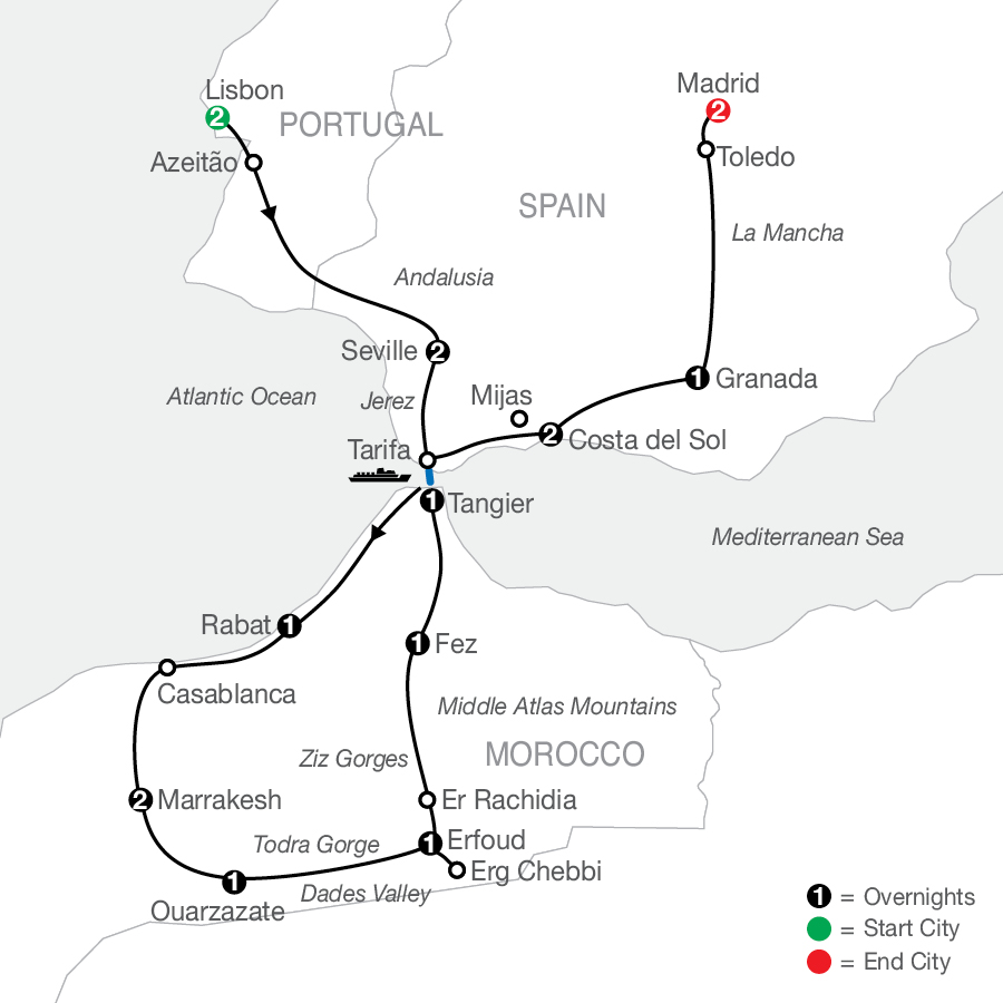 Embark on this gripping tour through the dramatic landscapes of Spain, Portugal, and Morocco. Moments destined to become memories abound as you stroll through Lisbon’s music-filled Alfama quarter, pick up the speed on a four-wheel drive tour in the Sahara, and slow it back down to catch some rays celebrity-style on Spain’s famous Costa del Sol. Keeping the plot line interesting, more action, adventure, and thrilling scenery await from the perpetual oasis of Marrakesh to the former sanctuary of Granada’s opulent Alhambra complex. With so many sights to gush over from Tangier to Toledo, it’s impossible to be “quiet on the set” on this tour of the Iberian Peninsula and Morocco.