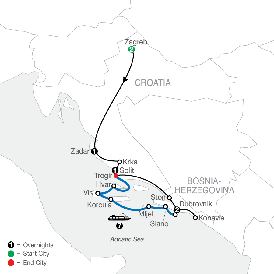 What’ll it be? Black risotto made with squid ink? Grilled sardines with garlic and lemon? Lamb and potatoes “under the bell”? This introductory tour of Croatia allows you to sample its local delicacies as well get a taste of the country’s greatest attributes. Modern coastal cities, magnificent medieval towns, and breathtaking natural wonders await at every turn. Get your fill of the lively cobblestone squares in the capital city of Zagreb, the magnificent Diocletian’s Palace in the seaside city of Split, the walled beauty of baroque Dubrovnik, and the magical waterfalls of Krka National Park. Enjoy a walking tour of Ston, famous for its oyster farms, and discover Konavle, known for its lush vineyards. On a clear day, you can see forever with a ride on the Dubrovnik Cable Car, as well as the most beautiful panoramic views from the Srd mountain. Take in the red rooftops below that glow in the sun beside the glittering Adriatic Sea. Board your Adriatic cruise in Croatia along the islands of the Dubrovnik Riviera and onward to Trogir!